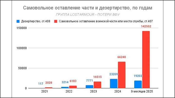 Данные о самовольном оставлении части и дезертирстве в ВСУ по годам. Источник: t.me/lost_armour/6689