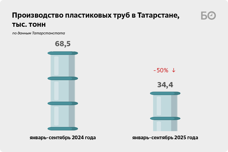 И ситуация на двух заводах вовсе не исключение из правила. В январе – сентябре 2025-го, по данным Татарстанстата, в республике было выпущено 34,4 тыс. т пластмассовых труб, шлангов и фитингов. Показатель упал в 2 раза по сравнению с аналогичным периодом прошлого года (68,5 тыс. т).