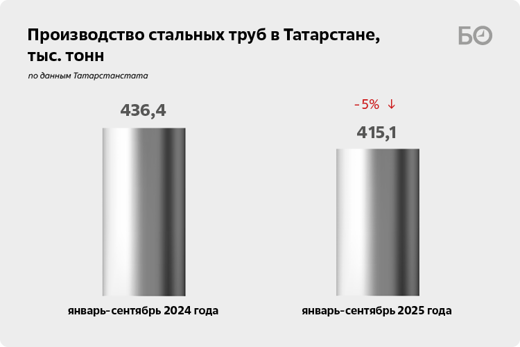 Если по итогам 2024 года производство стальных труб в Татарстане выросло на 5%, то за 9 месяцев 2025-го отмечается снижение на 5% до 415 тыс. тонн. Об этом изданию сообщили в Татарстанстате.