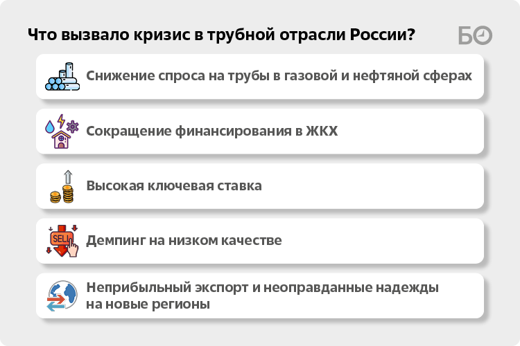 «Государственные деятели говорят, что охлаждают экономику — на самом деле они ее заморозили! Надо понимать, что во всех отраслях происходят процессы, которые по-другому называются выживанием. Ставку надо снижать в диапазоне 9–11 процентов. То, что по полпроцента сейчас снижают ставку, роли не играет», — называет источник другой негативный фактор для трубников.