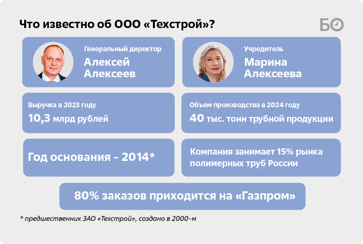 «Техстрой» с выручкой в 10,3 млрд рублей (в 2023 году) занимает примерно 15% всего рынка полимерных труб в России (в 2024-м он произвел около 40 тыс. т трубной продукции). Компанию как дистрибьютора ПАО «Казаньоргсинтез» основал в 2000 году Алексей Алексеев (сейчас занимает должность гендиректора). Уже в 2007-м было создано собственное производство полиэтиленовых труб. «Техстрой» — одна из немногих российских компаний, аккредитованных у «Газпрома». Продукция компании использовалась при строительстве спортивных объектов Олимпиады-2014 в Сочи, Универсиады в Казани, чемпионата мира по футболу в 2018-м.