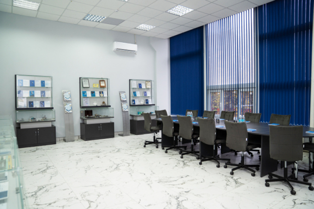 Современная обстановка и оборудование для совещаний, включая проектор, соседствуют с образцами продукции, документами и наградами, напоминая о том, что текущая работа продолжает дело нескольких поколений инженеров и производственников.