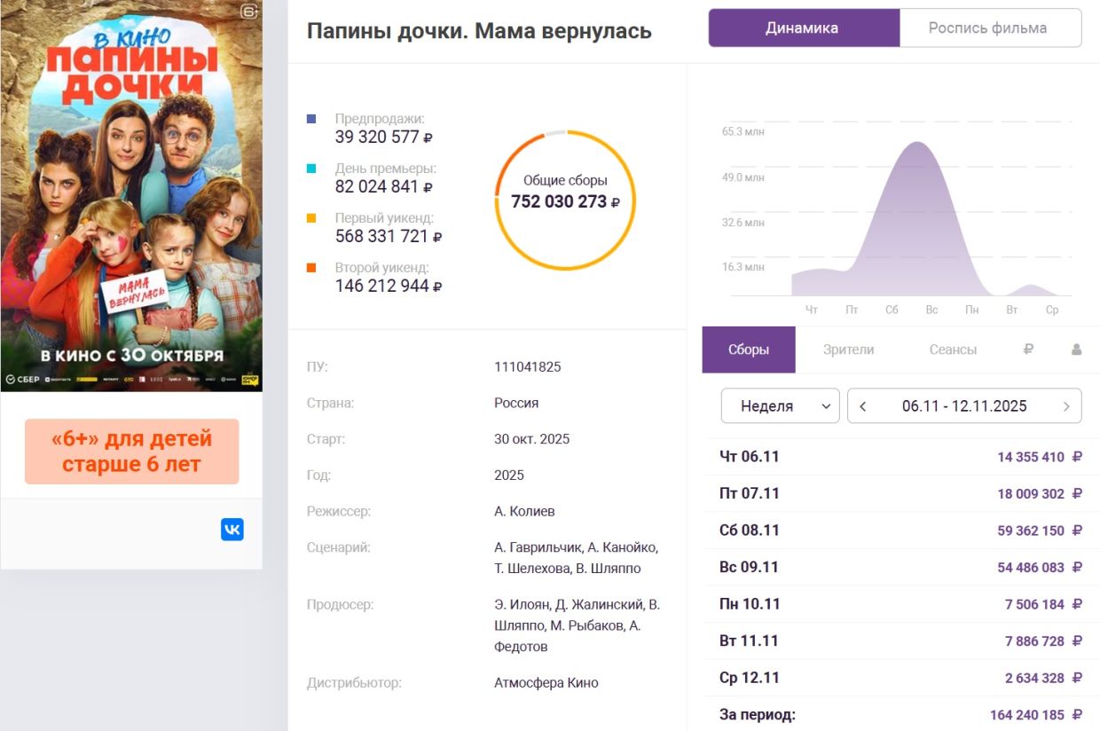 12 ноября сборы фильма «Папины дочки: Мама вернулась» достигли отметки в 750 млн рублей. Это произошло спустя две недели после выхода в прокат — сейчас продолжение знаменитого сериала возглавляет российский прокат вместе с «Горынычем» и «Алисой в стране чудес».