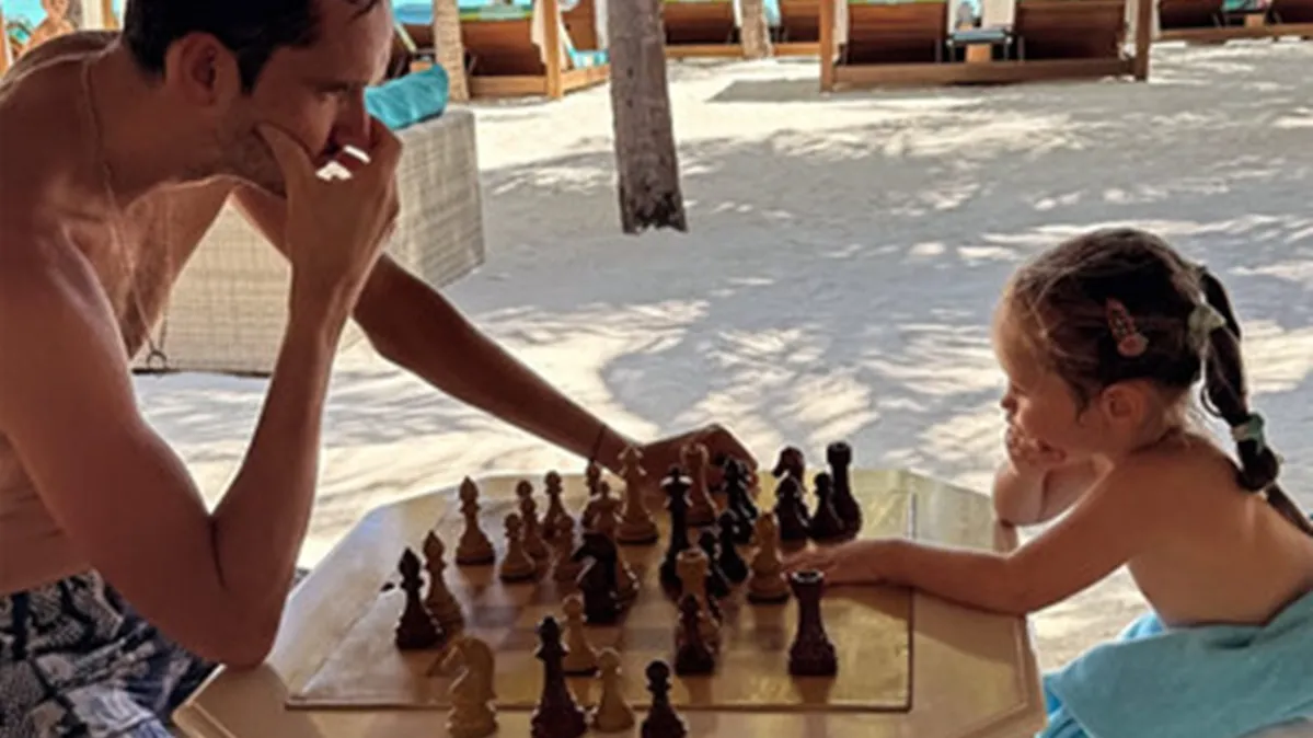 На одном из снимков спортсмен запечатлен за шахматной партией со своей дочерью Алисой во время отпуска.