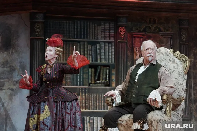 Актеры Евдокия Германова в роли Фрозины и народный артист РФ Леонид Якубович в роли Гарпагона во время генерального прогона спектакля «Скупой» по мотивам комедии Жана-Батиста Мольера в московском театре Et Cetera.