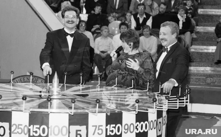 Ведущие «Поля чудес»: Владислав Листьев (слева), Леонид Якубович (справа) и актриса Клара Новикова на съемках 100-го эпизода программы