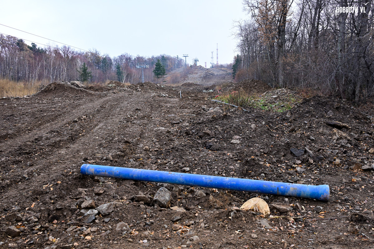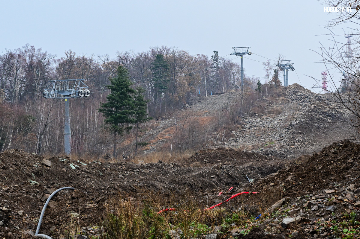 Отсюда начинаются действовавшие трассы «Бумеранг» и «Стрела». Их, по идее, должны привести к курортному уровню, а также запустить параллельно трассу «Молния», существовавшую ранее в виде просеки, без системы оснежения. И ещё откроют две новые зелёные трассы. Пока нет снега, судить о готовности трасс к сезону сложно. Но местами склоны невыровненные и засыпанные скальником.