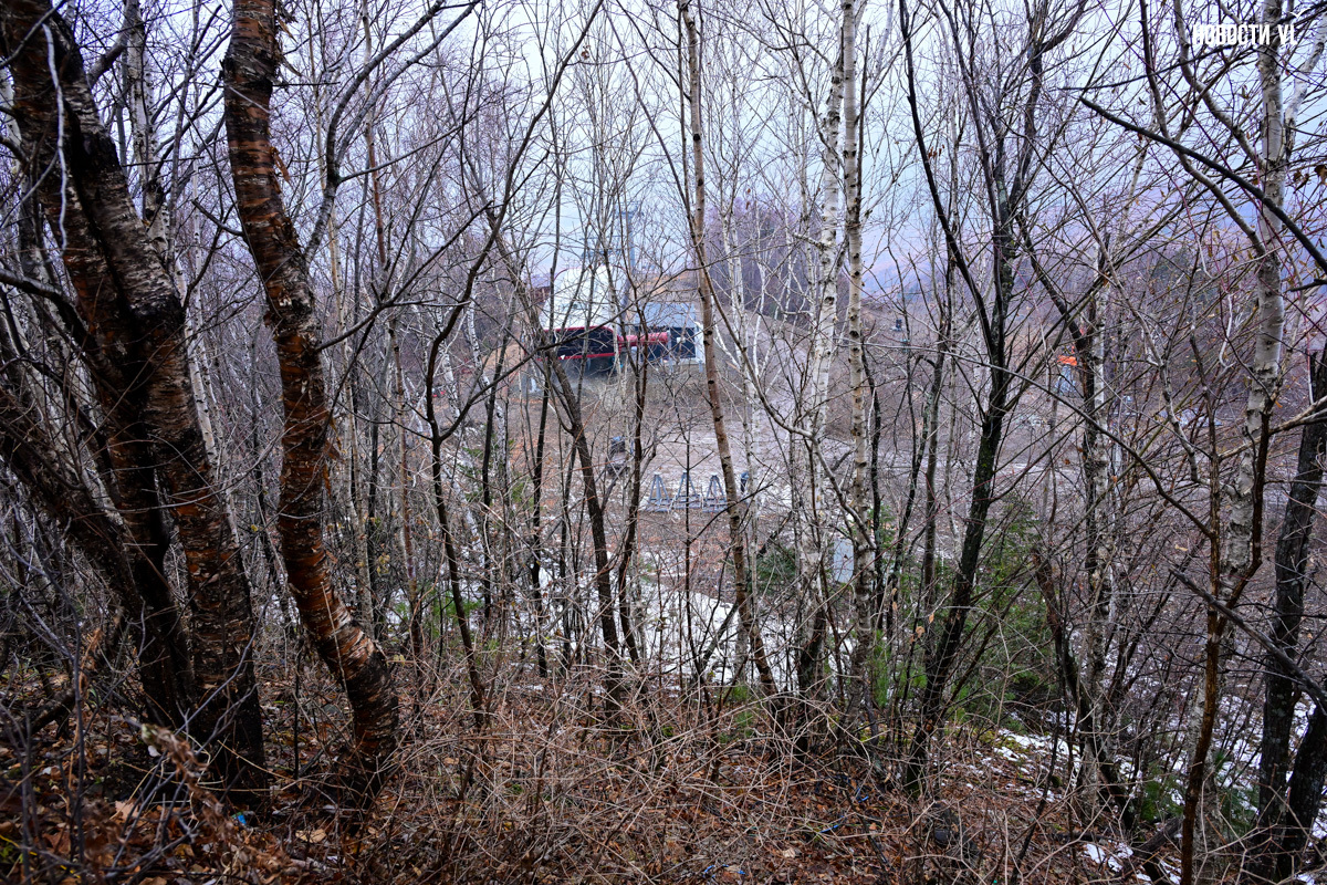 Зато можно на автомобиле заехать на вершину сопки по серпантину и посмотреть на уже готовую верхнюю станцию подъёмника Д. По грунтовке нужно преодолеть 6,4 километра, это займёт от 15 до 30 минут. Дорога ведёт к телевышкам. Раньше по ней за 500 рублей возили на микроавтобусах тех, кто не хотел ждать очереди на подъёмник. Сегодня спуститься с дороги к станции канатки не получится – проход от телевышек закрыли железным щитом и насыпали кучу гравия. Получается, что и с канатки пройти в сторону вершины нельзя.