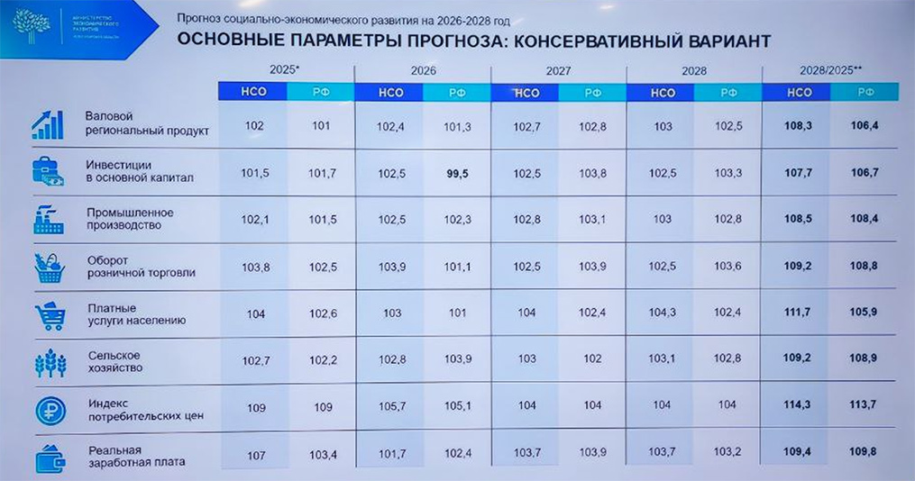 Министерством сформировано три варианта прогноза: консервативный, целевой и инновационный. При этом консервативный вариант приравнивается к базовому, который и был использован для планирования бюджета. Согласно этому варианту, вопреки всем негативным тенденциям, в 2026 году рост валового регионального продукта Новосибирской области составит 2,4%, вырастут также все основные экономические индексы (см. таблицу).