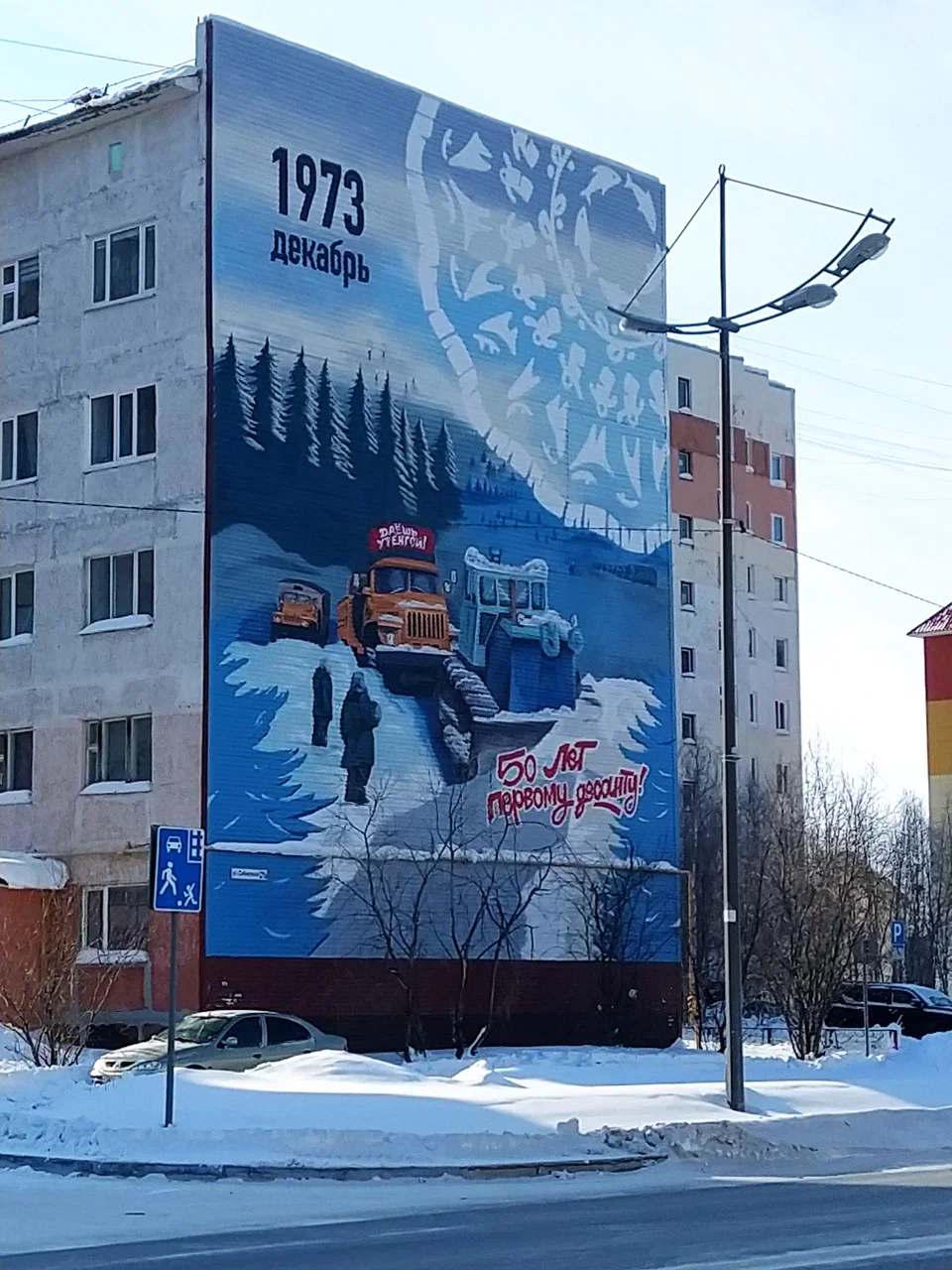 Мурал, посвященный десанту на Уренгой, на стене одного из домов Нового Уренгоя
