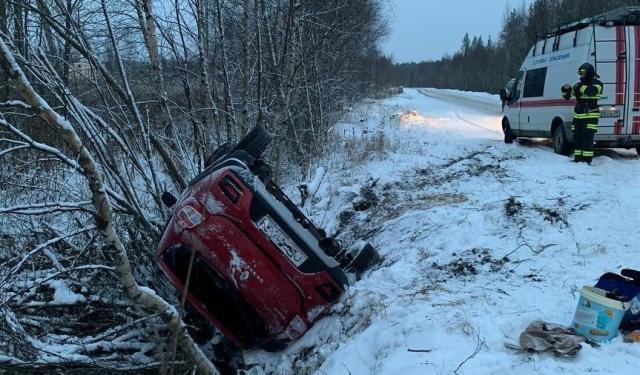 По информации службы спасения Северодвинска, водитель автомобиля Renault Sandero не справился с управлением и съехал в кювет с последующим опрокидыванием. \