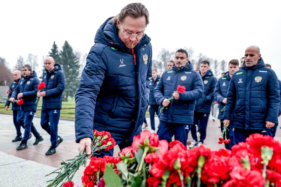 Меж тем члены тренерского штаба сборной вместе с футболистами посетили Пискарёвское мемориальное кладбище и почтили память защитников блокадного Ленинграда и мирных жителей, погибших в годы Великой Отечественной войны. Валерий Карпин и Александр Головин оставили записи в книге для почётных гостей. Присоединился к поездке и другой легионер из Лиги 1, Матвей Сафонов, хотя прибыл в расположение команды только ночью.