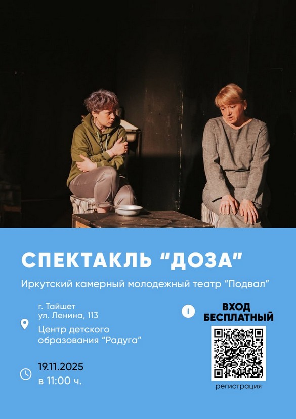 В Тайшете (Центр дополнительного образования «Радуга») 19 ноября состоится показ профилактического спектакля «Доза» (12+). Постановка иркутского молодежного камерного театра «Подвал» посвящена проблеме наркомании и ее разрушительным последствиям.