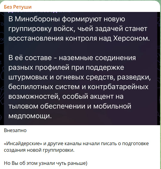 Херсону приготовиться. Многие считают, и в принципе это логично, что форсировать Днепр будет невозможно. Но все острова уже под нашим контролем, и, зацепившись за промышленную зону, а после создав небольшой плацдарм, – всё станет возможным, а может, происходит уже прямо сейчас. <…> Те, кто думали, что появление новой группировки войск – это ложь, скоро будут удивлены. <…> Удар по Харькову будет. Удар по Херсону будет. А ещё будет удар куда больнее,
