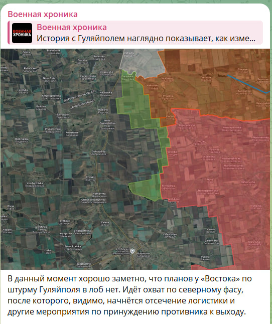 Западные осинтеры полагают, что наши войска не станут штурмовать Гуляйполе в лоб. По одной из версий, они могут обойти укрепрайоны ВСУ с севера и, сделав небольшой крюк, двинутся дальше на запад. Это даст шанс прорвать основную линию укреплений в районе Гуляйполя и нанести рассекающий удар в сторону Запорожья.