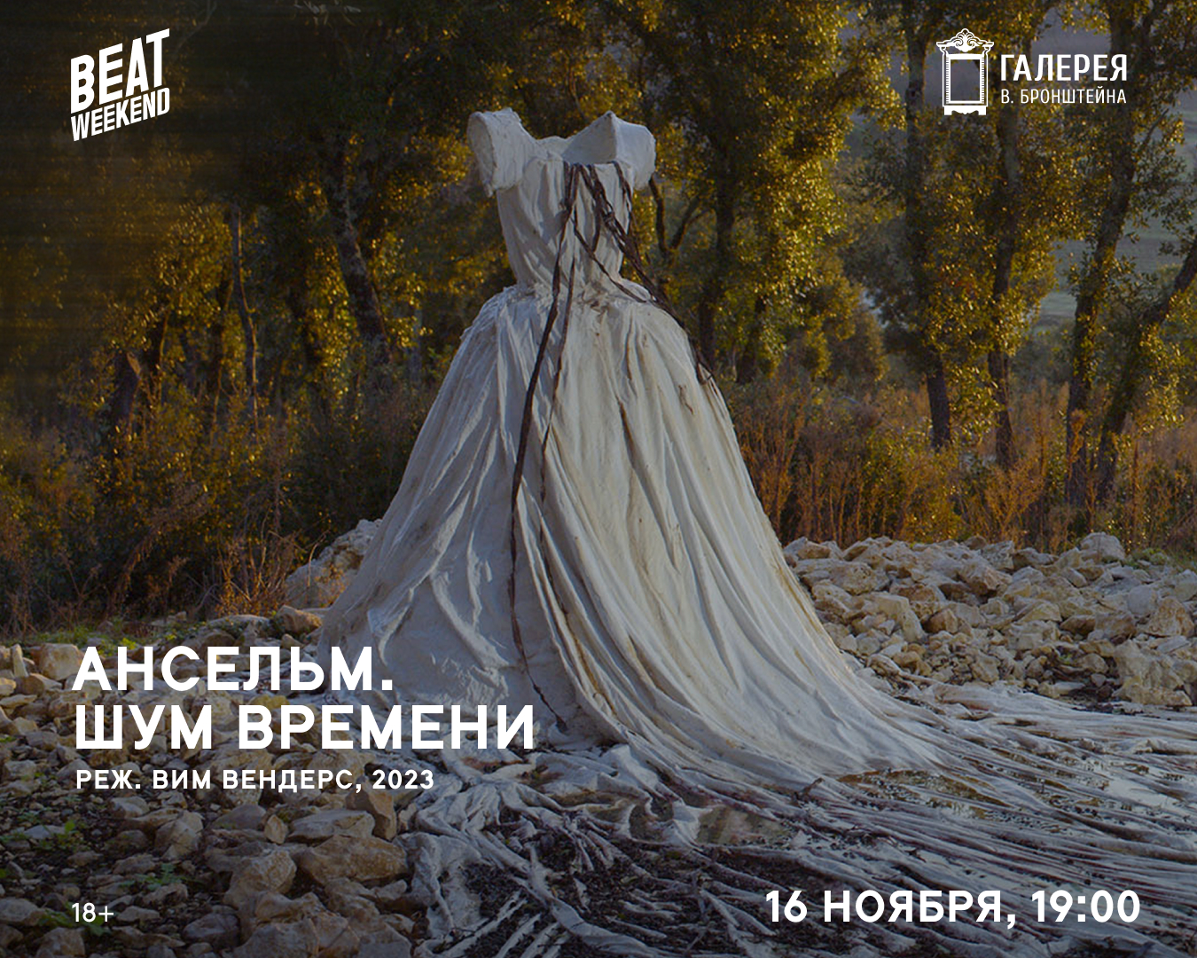 С 14 по 23 ноября в Галерее В. Бронштейна пройдет фестиваль документального кино о культуре Beat Weekend. Зрителей ждет программа из лучших фильмов летнего Beat Film Festival. 16 ноября покажут фильм «Ансельм. Шум времени». Это масштабное исследование творчества художника Ансельма Кифера от режиссера Вима Вендерса.