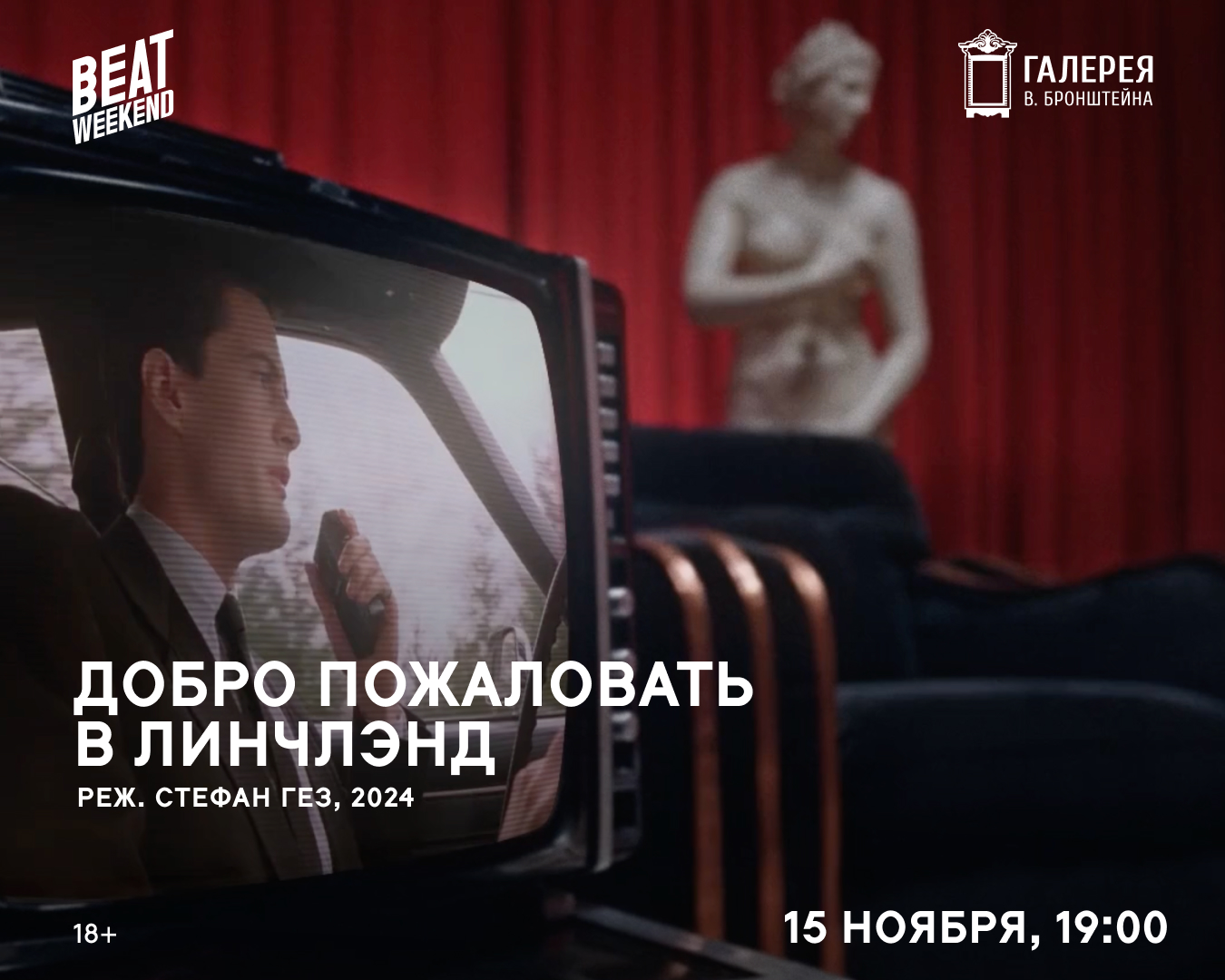 С 14 по 23 ноября в Галерее В. Бронштейна пройдет фестиваль документального кино о культуре Beat Weekend. Зрителей ждет программа из лучших фильмов летнего Beat Film Festival. 15 ноября покажут премьеру «Добро пожаловать в Линчлэнд» с участием звезд Дэвида Линча: Кайла Маклахлена, Изабеллы Росселлини и Лоры Дерн.