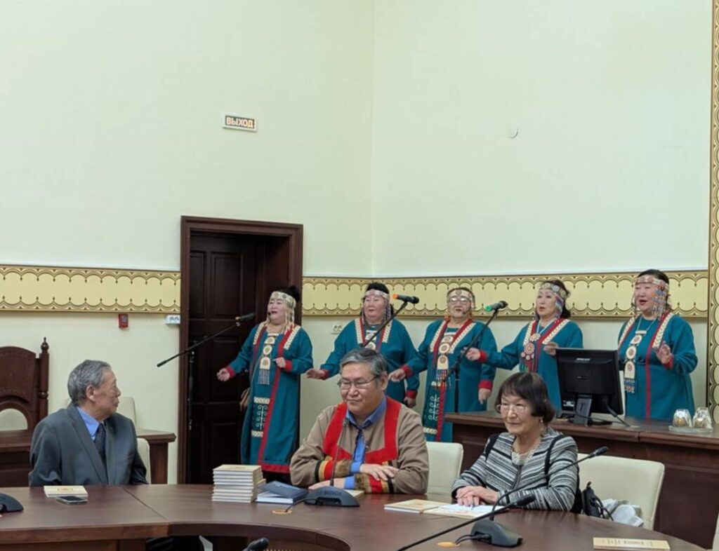 Людмила Николаевна сообщила, что трилогия будет издаваться в течении трех лет, вторая часть посвящена этнографии лесных юкагиров, третья часть – палеоэтнографии и археологии. По ее словам, по наскальным рисункам позднего неолита и бронзового века можно узнать, какие охотничьи традиции существовали у древнего населения, их частично сохраняют современные лесные юкагиры. Исследовательница также отмечает, что древние пласты истории юкагирского народа недоступны археологам из-за наземных типов захоронений, практиковавшихся в прошлом. Поэтому все внимание направлено на фольклор и наскальное искусство. Фольклор раскрывает такие традиции как свадебные обряды, песенное творчество, бытовавшие орудия труда и охоты. Благодаря носителям фольклора и народных знаний были воссозданы традиционные музыкальные инструменты, которых апробировал ансамбль «Колымчанка». Людмила Николаевна с теплотой отзывается о своих экспедициях в село Нелемное и поселок Зырянка к лесным юкагирам, с которыми много лет работала, они старались сохранить родную культуру и язык, активно сотрудничая с исследователями. Также Людмилу Николаевну поздравили директор ИГИиПМНС СО РАН, доктор исторических наук Сардана Ильинична Боякова. Председатель Ассоциации юкагиров РС(Я), редактор портала коренных народов Севера «Илкэн» Ирина Семеновна Курилова отметила, что Людмила Николаевна сотрудничает с газетой «Илкэн» и вручила ей Благодарственное письмо. Участницы выступившего на презентации книги юкагирского этнофольклорного ансамбля «Колымчанка» выразили благодарность за советы, наставления и помощь. Также поздравили коллеги, к.э.н., старший научный сотрудник Института Саргылана Макаровна Баишева, канд. искусствоведения, доцент АГИКиИ Татьяна Иннокентьевна Игнатьева, искусствовед Зинаида Ивановна Иванова-Унарова.