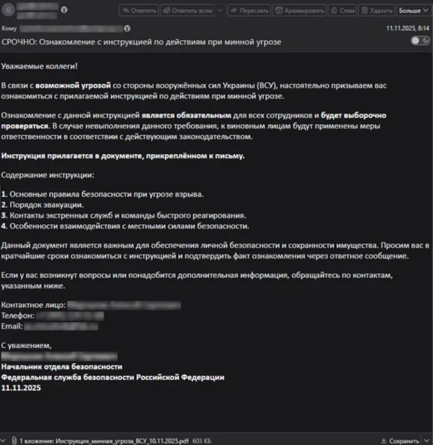 Аналитики компании F6 выявили новую кампанию вредоносных рассылок, направленных против российских организаций. Злоумышленники рассылают письма под видом инструкций по действиям при минной угрозе и требований предоставить отчётность по противодействию информационным атакам. Кампания по распространению бэкдора CapDoor получила название CapFIX. Первая вредоносная рассылка была зафиксирована 11 ноября 2025 года. Целями атаки стали коллекторское агентство, финансовое учреждение и страховая компания. Письма рассылались с использованием подмены адреса почты российского турагентства и имели тему «СРОЧНО: Ознакомление с инструкцией по действиям при минной угрозе». Во вложении находился файл Инструкция_минная_угроза_ВСУ_10.11.2025.pdf, побуждающий пользователя скачать программный комплекс КриптоПро для корректного отображения документа. Ссылка вела не на заявленный сайт, а на домен, зарегистрированный злоумышленниками — sed-documents[.]com. При переходе по ссылке на устройство жертвы загружался архив «Пакет установки КриптоПРО.rar», защищённый паролем криптопро2025. В архиве содержался MSI-файл, который распаковывал CAB-файл, устанавливал приложение VB Decompiler Lite и запускал файл architect-stats.exe — настоящий, подписанный цифровой подписью. Он использовался для загрузки вредоносного ПО через технику DLL Side-Loading. Во время выполнения создавался файл-маркер C:\ProgramData\lockfile, предотвращающий повторный запуск — такой же применялся в предыдущих версиях CapDoor. Бэкдор взаимодействовал с управляющим сервером hxxp://213.165.61.133/search/?text=[a-z]{30}, получая команды на запуск PowerShell-команд, загрузку и выполнение EXE- и DLL-файлов, а также регистрацию DLL-COM-объектов. Финальная нагрузка представляла собой модифицированную версию CapDoor для x64-архитектуры. 12 и 13 ноября система F6 MXDR зафиксировала повторные рассылки в адрес сетевого ритейлера и финансовых организаций. Новые письма имели темы: Прикреплённые PDF-файлы содержали ссылки на загрузку архивов с тем же вредоносным MSI-файлом. В рассылке использовались поддельные адреса российской IT-компании.