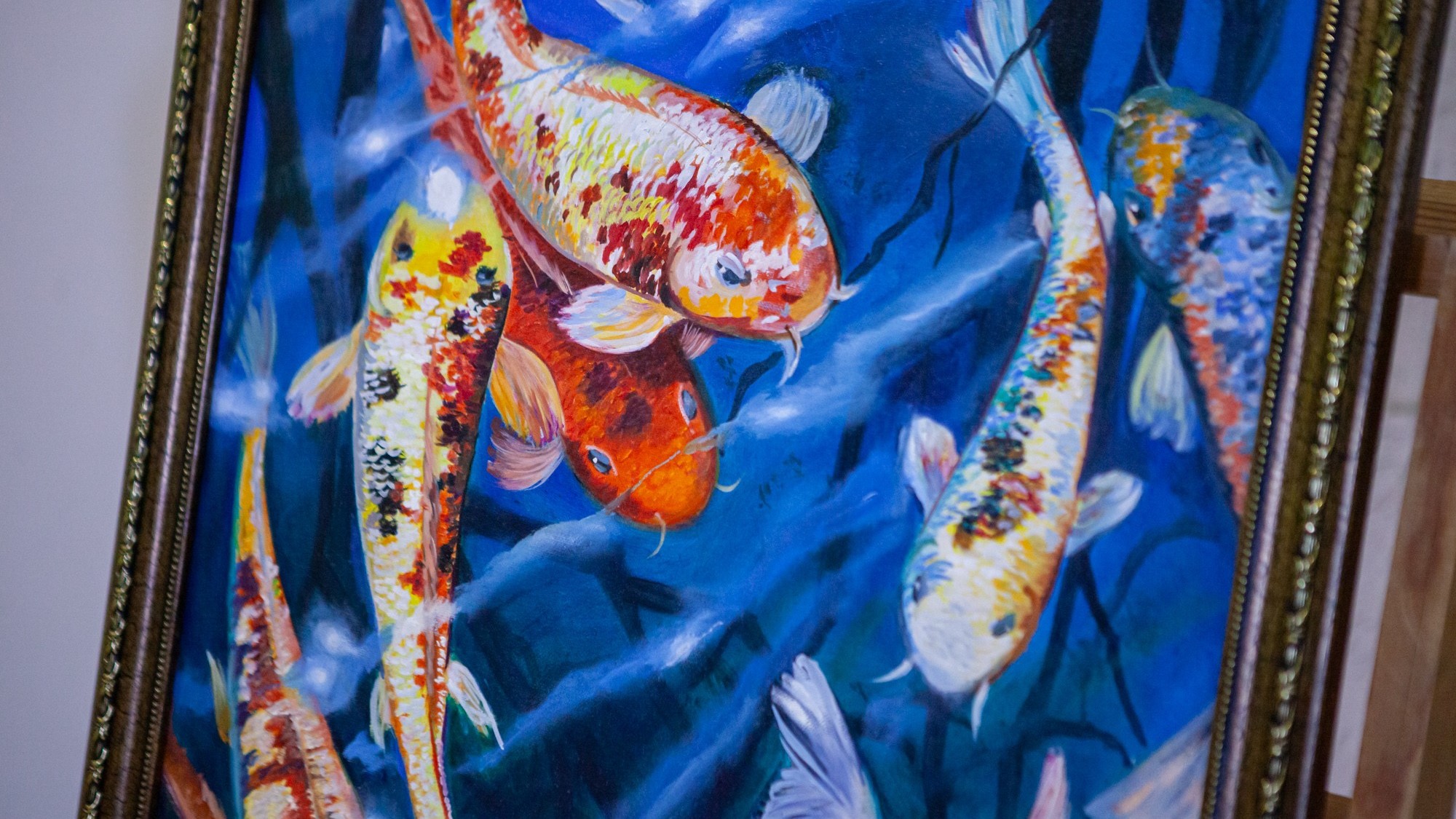 С картин на зрителей смотрят девушка с бусами, мудрая сова, длиннохвостый павлин, золотые рыбки, рыжий пес. Рядом виды на море, горы, уютный сад, сочные натюрморты. Узнаваемы мотивы знаменитых художников: Даниэля Гарбера, Леонида Афремова, Александра Калама, Дэвида Чейфиц. В каждой работе ощущается глубина и движение за счет светотеней и бликов, картины реалистичные, выразительные и эмоциональные. Черно-белые работы соседствуют с яркими и пастельными приглушенными тонами.