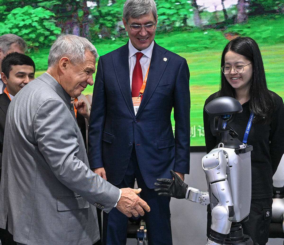 Особый интерес у делегации Татарстана вызвали человекоподобные роботы. Рустам Минниханов поздоровался с одним из них за руку