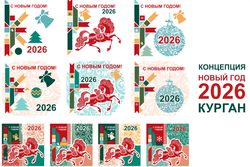 Изображениями в своём телеграм-канале поделился мэр Антон Науменко. В новогодней концепции 2026-го главный герой - красный конь. Он нарисован на фоне морозных узоров. Также на всех баннерах присутствует привычное курганцам оформление - красные, жёлтые и зелёные геометрические фигуры. Добавили на плакаты новогодние колокольчики, ёлки и снежинки.