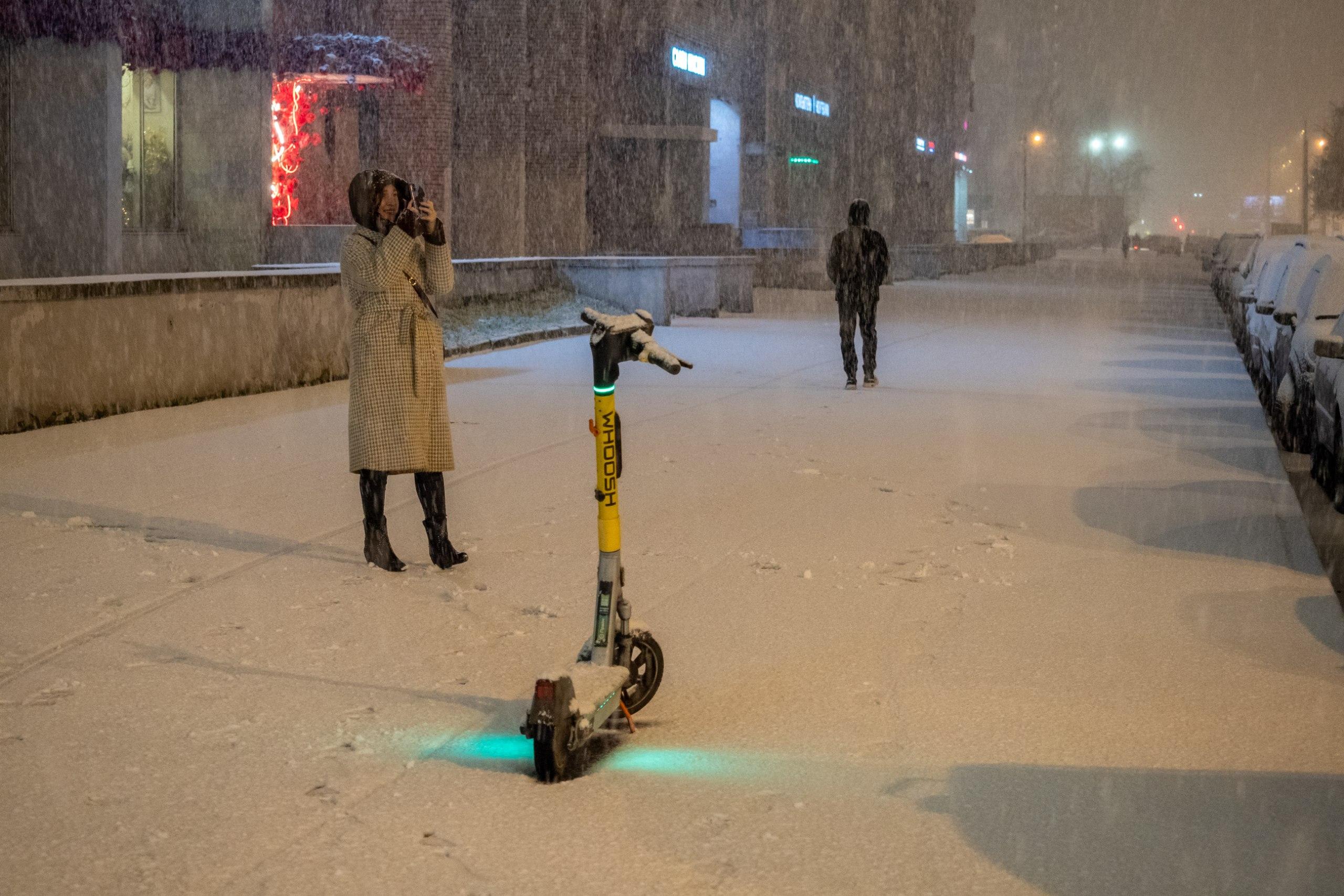 Многие горожане радуются первому снегу и останавливаются, чтобы сделать селфи на фоне метели.