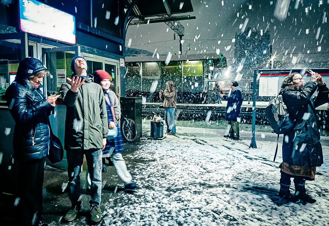 Многие останавливаются, чтобы сделать селфи на фоне снегопада