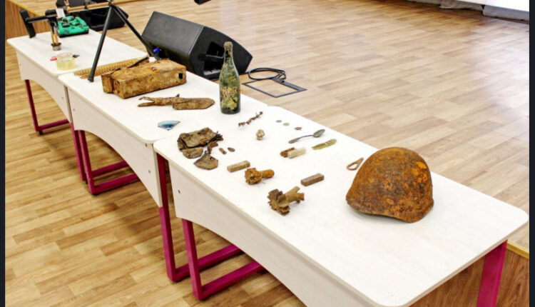В актовом зале школы была организована выставка артефактов с места поисковых работ на Зайцевой горе.