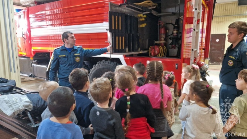 Маленьким гостям показали пожарную технику и рассказали для чего служит тот или иной предмет. Продемонстрировали боевую одежду, а также оснащение пожарного выезжающего по вызову на борьбу огненной стихией.