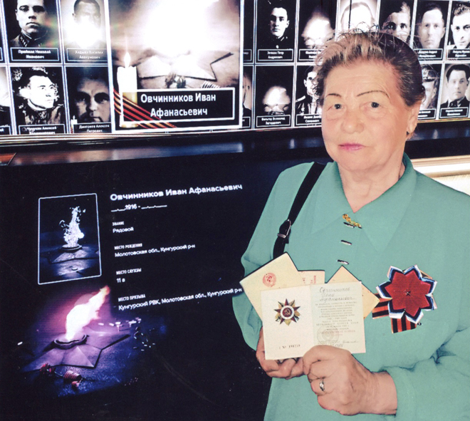 Вот так с вероломного ночного нападения на наши мирные спящие города, фашистская Германия начала осуществлять свой преступный хорошо подготовленный план молниеносной войны против СССР. 3 июля 1941 г. Сталин выступил по радио с обращением к советскому народу и бойцам армии и флота. В конце речи сообщил что немецкая авиация бомбит Мурманск, Оршу, Могилев, Смоленск, Киев, Одессу, Севастополь… Масштабные разрушения городов, сотни тысяч погибших среди мирного населения и бойцов Красной армии в первые часы, дни, месяцы войны показали полную неготовность СССР к войне. Большая тройка. За редким кадром очередь. Но выстоял великий наш солдат! Весь многонациональный советский народ встал на защиту своей Родины. Тысячи примеров массового и личного героизма на фронте, героический самоотверженный труд в тылу врага. Вместе сообща победили такого монстра-зверя, но очень дорогой ценой. Всем отстоявшим Отечество - низкий поклон! Владимир Путин Города-Герои - 13, города Воинской Славы - 45. Экспозиция музея-мультимедийной галереи «Дорога Памяти» - это подробная интересная с яркими кадрами военной хроники правдивая история 1418 дней войны. Каждый день стал символическим шагом, который приближает к Великой Победе. Размещена в 35 тематических залах (небольших), 26 из которых иммерсионные (панорамные). Это значит, что посетитель, как бы, на самом деле оказывается на полях сражений, в полевом госпитале, среди руин освобожденного города, на куполе Рейхстага со Знаменем Победы и прошёл с парадом по Красной площади. Я задержалась в зале - подвиг советских медиков. Перед глазами полевой госпиталь - идёт операция. Все надежды раненых на хирургов… И спасали, по 10 -12 часов стояли у операционного стола. Бог им помогал - давал силы врачам. Тут же в кадре цифры: за войну было госпитализировано 22.326.957 человек. 84.793 медика отдали свою жизнь и пропали без вести. 45-и военным медикам присвоено звание героя Советского Союза Никто не забыт, ничто не забыто. 1418 дней войны унесли свыше 26.600.000 жизней. Более половины пленных советских солдат погибло в фашистских лагерях. Война пришла в каждый дом, но в каждый дом пришла и Победа. Большой интерес для посетителей галереи представляет интерактивная система «Река времени». На ней фотографии (не у всех) тысяч участников с краткой базой данных о каждом. А всего база архивов Минобороны хранит информацию о более 33 миллионов, кто внёс свой вклад в Великую Победу. Л.И. Овчинникова у интерактивной панели с информацией об отце. Гордится им и бережно сохраняет награды и удостоверения к ним Мне было очень важно найти в системе моего отца. Воевал с лета 1941 г. по октябрь 1944 г. Рядовой-шофёр 11 армии Западного фронта, дважды ранен. Молодая сотрудница музея-галереи быстро «прошлась» по системе - вашего отца нет. Это как!? У меня в руках орденская книжка награжденного орденом Отечественной Войны I степени (самая высокая) и ещё 4 удостоверения к медалям (я ещё не все взяла). - Ну вот ваш Кунгурский район, но область же не ваша, а Молотовская. - Девушка, да как же вы не знаете наш огромный богатый прекрасный Пермский край. Он ещё и постоянный донор всех вот таких важных дел в стране. Самое лучшее место в России - приезжайте к нам в гости. Поулыбались, сделали фото. Ещё поискали (пока она снова не забыла) моих родных дядей - ещё четверо воевали. Я вышла из музея-галереи счастл