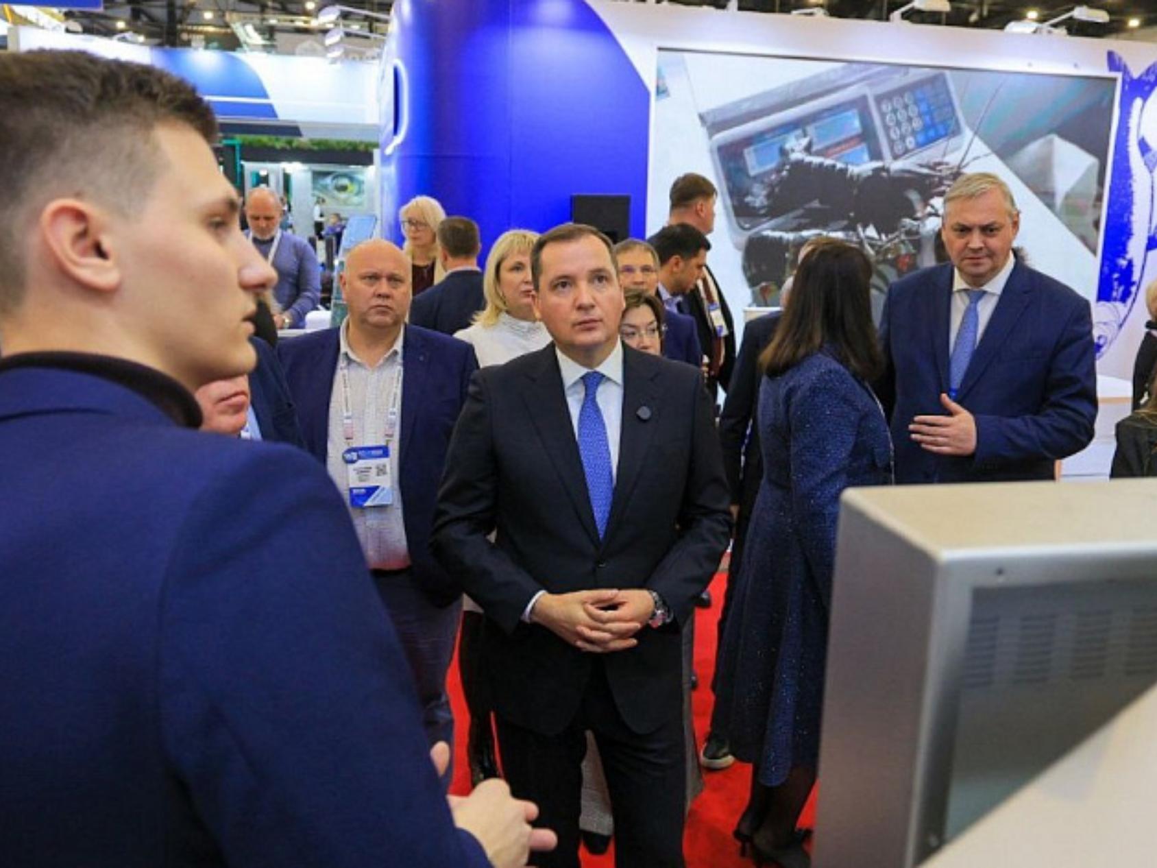 Губернатор Александр Цыбульский на площадке рыбопромышленного форума с Артёмом Шендриком и Арсением Репиным из САФУ – разработчиками проекта сортировки рыбы с применением компьютерного зрения