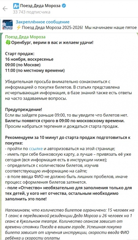Организаторы напоминают, что билеты появляются строго в 09:00 по московскому времени, и успешная покупка зависит от скорости оформления и оплаты. Количество мест ограничено. Всего 15 человек могут попасть на один сеанс в передвижной резиденции и 26 - стать зрителями кукольного театра. Также желающим советуют обновлять страницу в течение часа - иногда возвращаются отменённые билеты. Так что, возможно, шанс ещё есть.