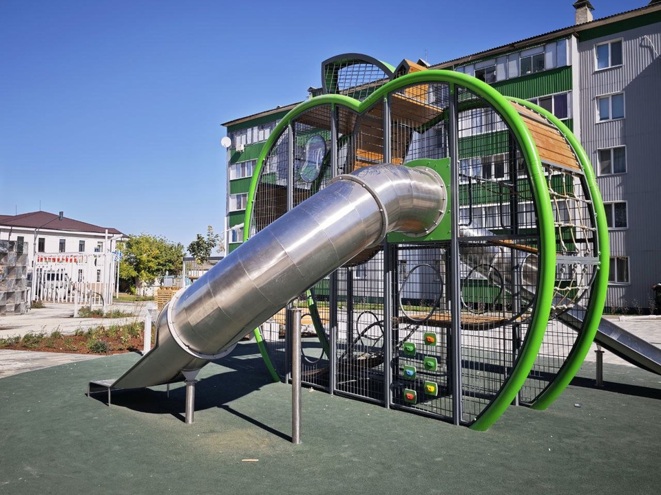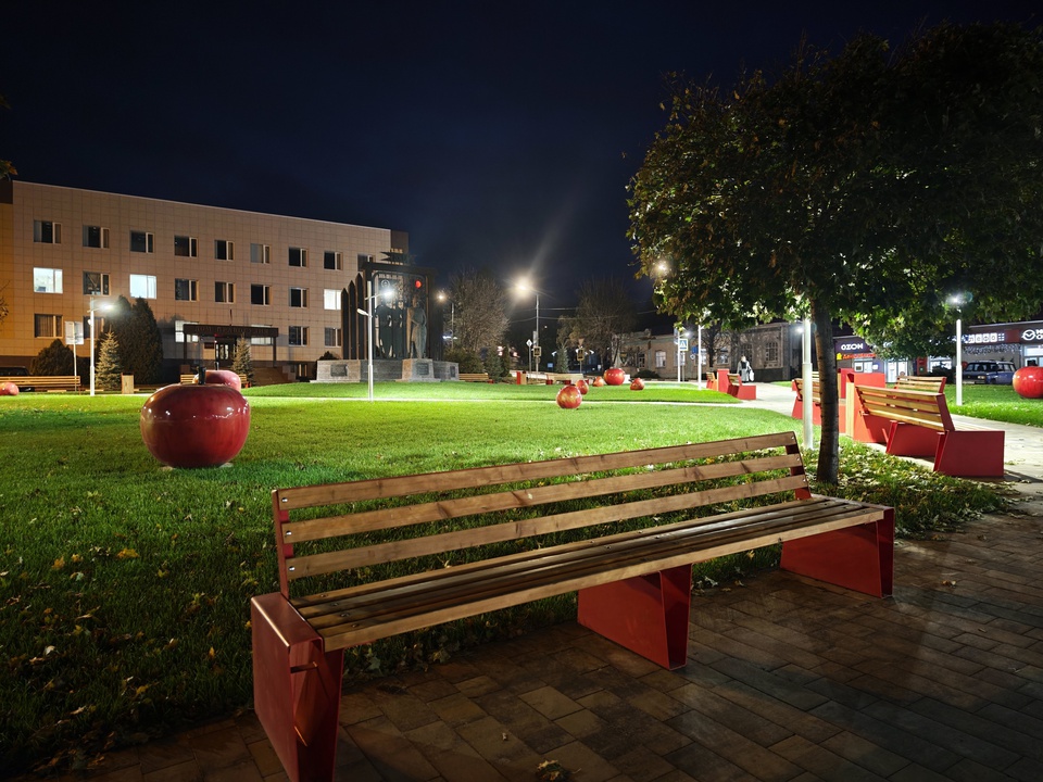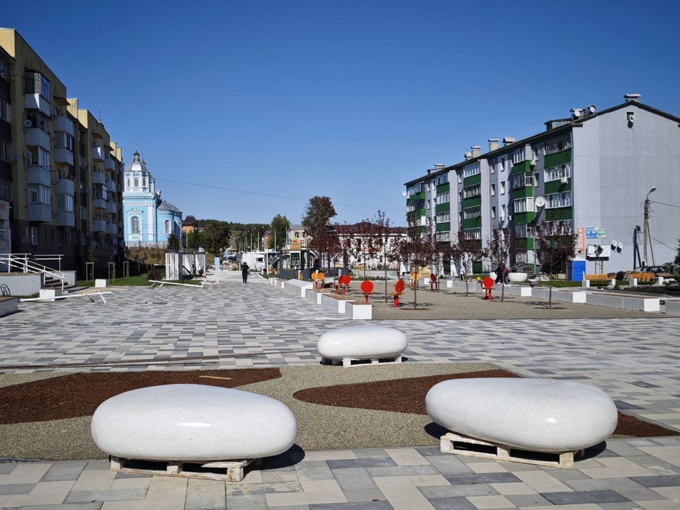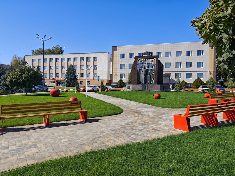 В результате масштабного благоустройства рабочие уложили более 7 тысяч квадратных метров тротуарной плитки, высадили более 500 деревьев и кустарников, обустроили современные системы полива и освещения. Среди ярких элементов оформления выделяются оригинальный детский игровой комплекс «Яблоко», уютные теневые навесы, удобные лавочки и арт-объекты, символизирующие историю города — «Городская панорама», «Колодец» и «Крепость».