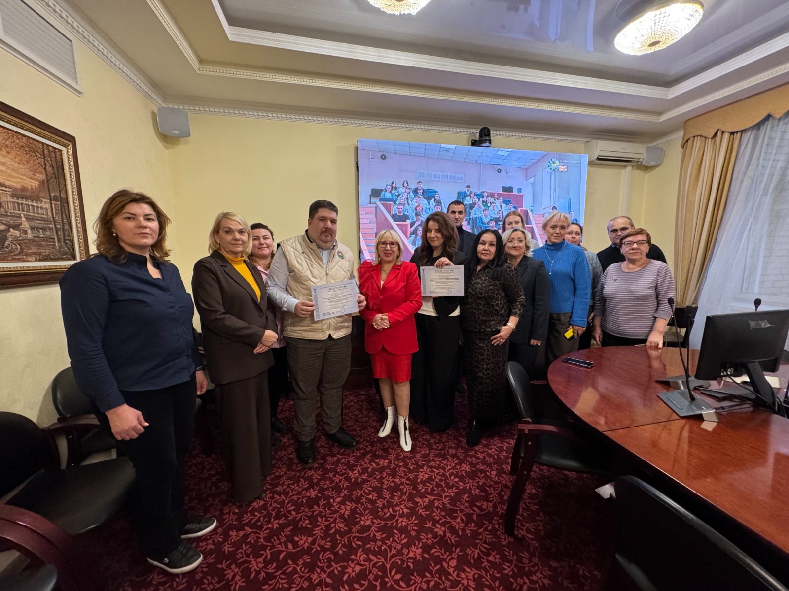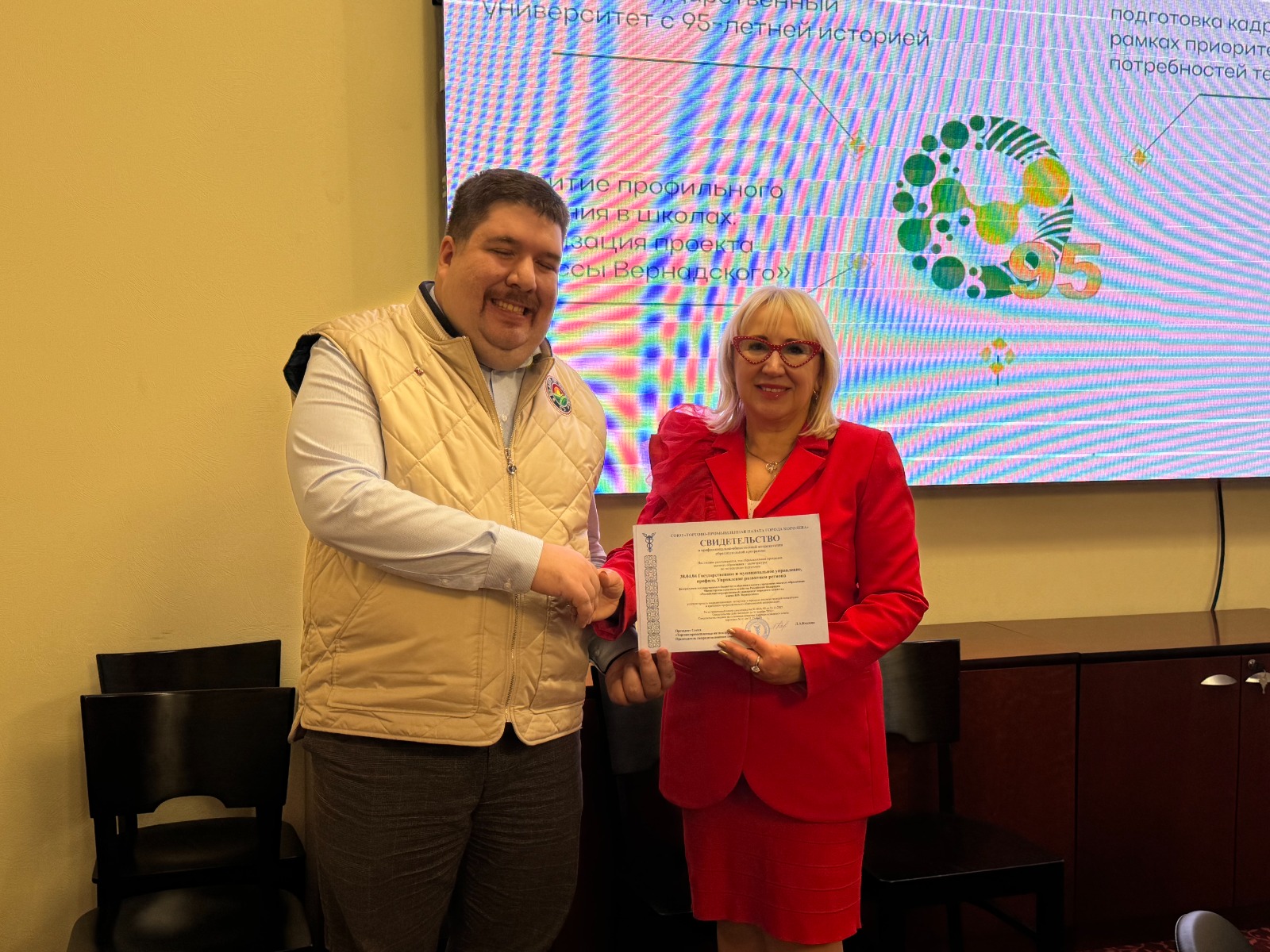 Президент ТППК Людмила Козлова торжественно вручила проректору Университета им. Вернадского Андрею Тихонову свидетельства о прохождении профессионально-общественной аккредитации.