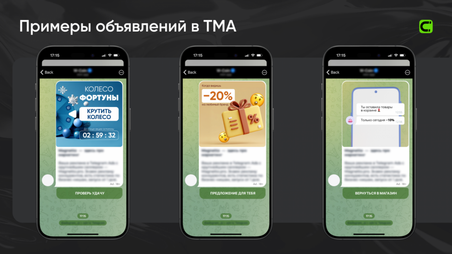 Для ретейлеров Telegram Mini Apps и реклама в TMA — это инструмент быстрого старта и масштабирования праздничных распродаж. Благодаря уникальным возможностям, которых нет на других площадках и даже в Telegram Ads, вы можете получить более дешевые лиды и вовлеченных клиентов с долгим сроком «жизни».