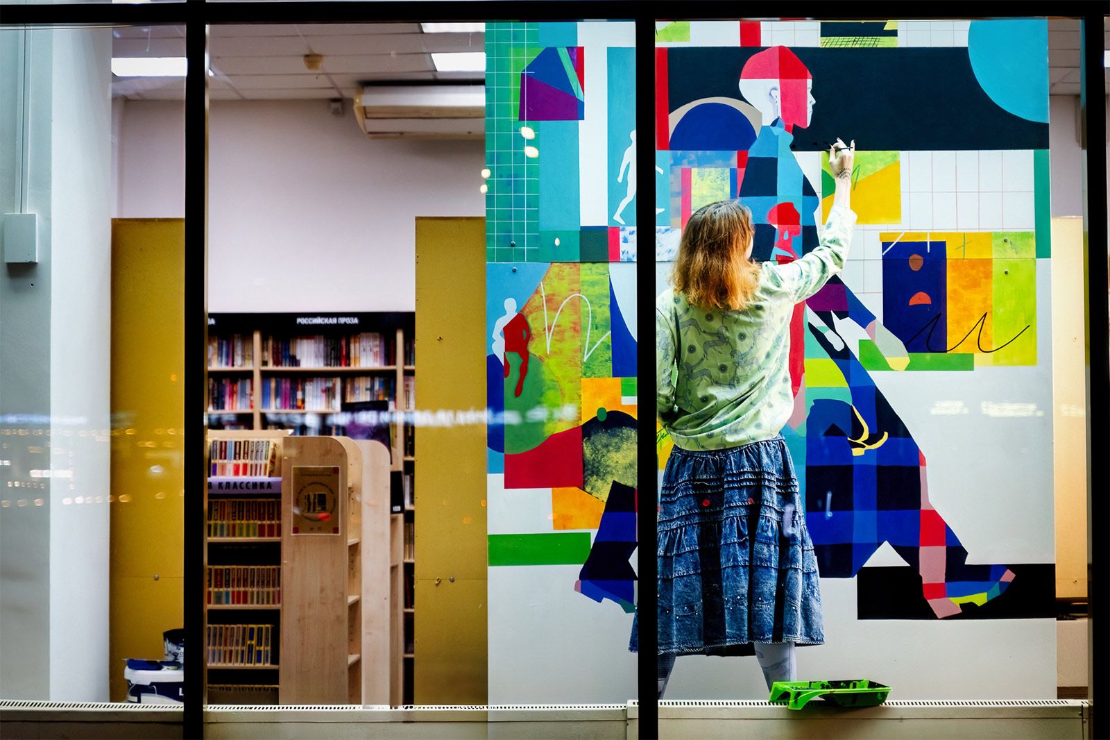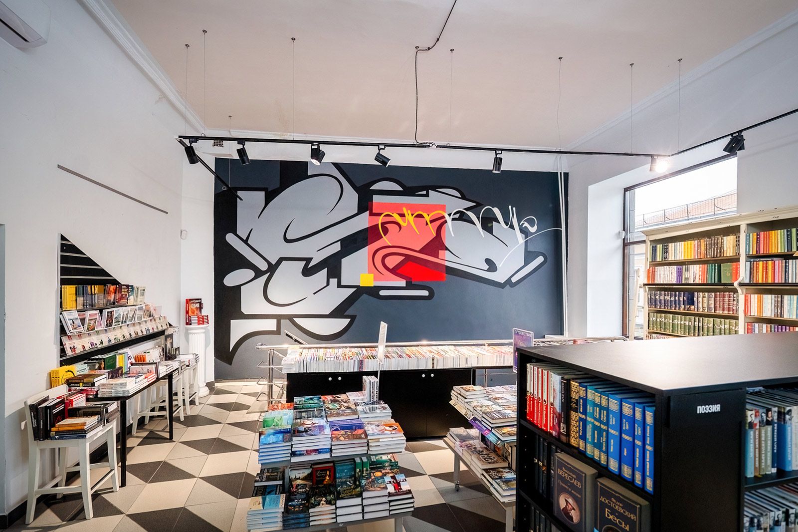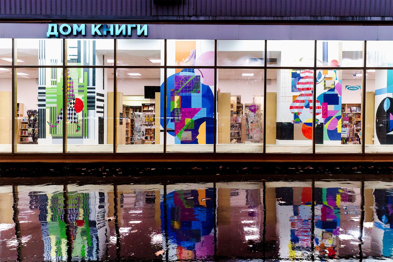 Яркая и насыщенная работа «Диалог» Степана Краснова в «Доме книги на Преображенке» соединяет в себе поп-арт и граффити, рассказывая историю жизни книги — от рождения идеи до встречи с читателем, наполненную комиксными персонажами, буквами и фрагментами текстов. А в «Доме книги на Ленинском» художница Полина Гаврилова вдохновилась рукописным альманахом Корнея Чуковского «Чукоккала», создав масштабную роспись «Переписанное небо», в которой объединила классицизм, конструктивизм, супрематизм и графику.