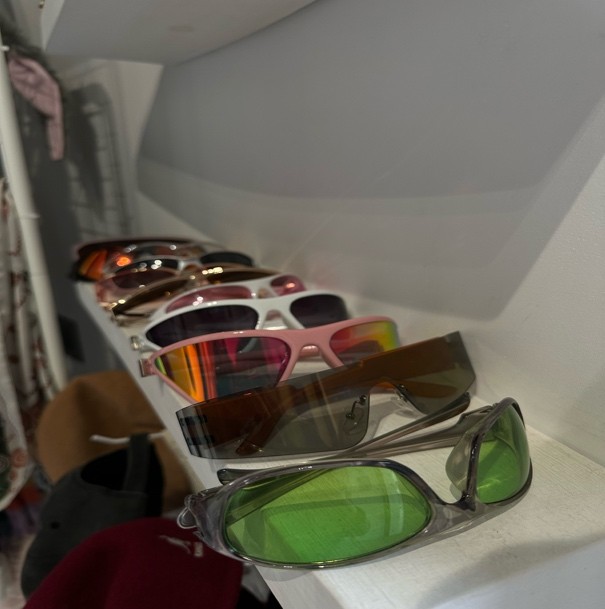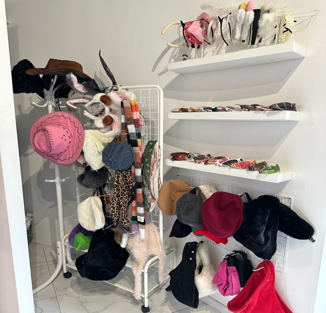 Особое внимание привлекают полки с очками самых разных форм и цветов, шляпы, шарфы и другие аксессуары. Реквизит позволяет моментально менять образ: от ретро-стиля до современного арта фотосессии.