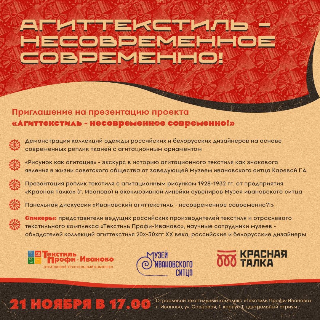 21 ноября в 17.00 в отраслевом текстильном комплексе «ТекстильПрофи-Иваново» пройдет презентация современной коллекции реплик агитационного текстиля «Несовременное современно!».
