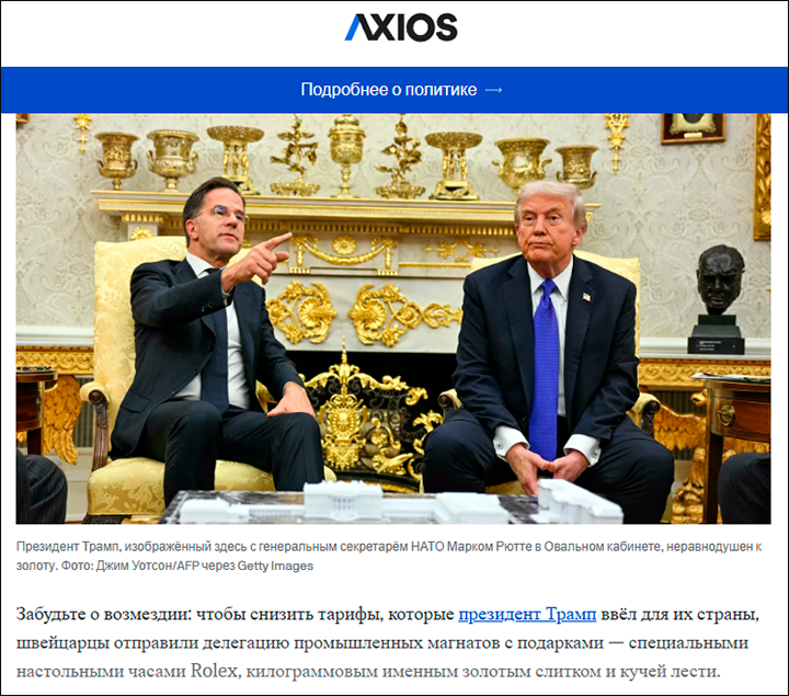 "Подарочная дипломатия" — в действии. Группа швейцарских бизнесменов в США вручила американскому президенту настольные часы Rolex и золотой слиток. Подарок — с подтекстом. Бизнесмены, похоже, напомнили, что Швейцария — "золотой стандарт" экономики, что с ней нужно дружить, и намекали на снижение пошлин. И ведь получилось! После визита делегации США "уронили" тариф с 39 до 15%. Швейцарцы, правда, согласились увеличить инвестиции в американскую экономику.