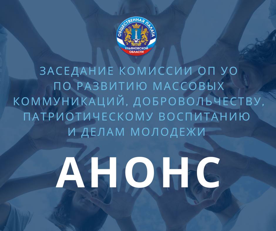 19 ноября в 11.00 час. состоится заседание комиссии Общественной палаты Ульяновской области по развитию массовых коммуникаций, добровольчеству, патриотическому воспитанию и делам молодёжи