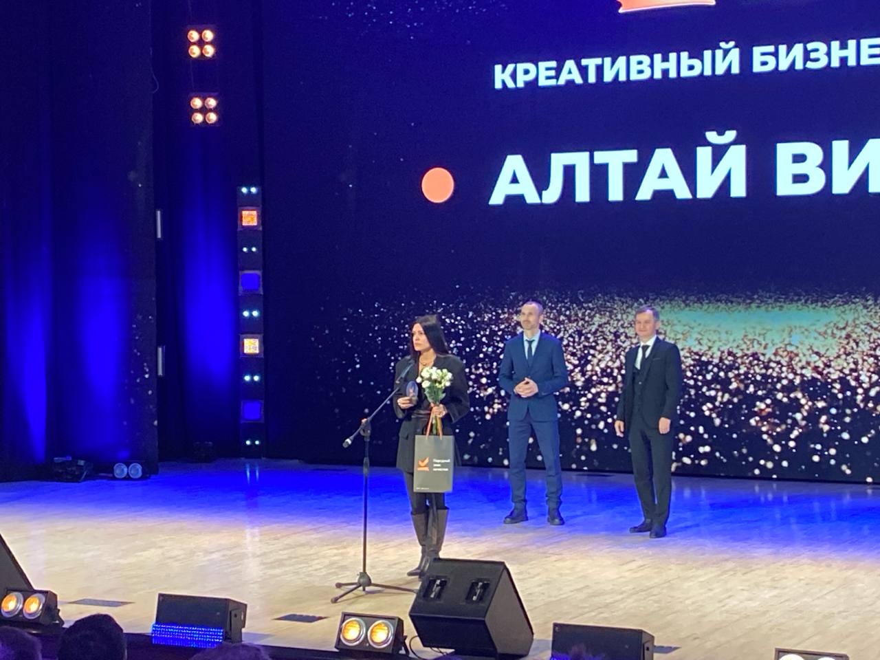 18:59 В номинации "Креативный бизнес года" в тройку финалистов вошли: студия художественного витража "Алтай Витраж", СММ-агентство "Мари Трап", студия дизайна интерьера R&B. Для объявления победителя пригласили министра цифрового развития и связи Алтайского края Евгения Зрюмова и руководителя регионального центра "Мой Бизнес" Станислава Татаринцева.