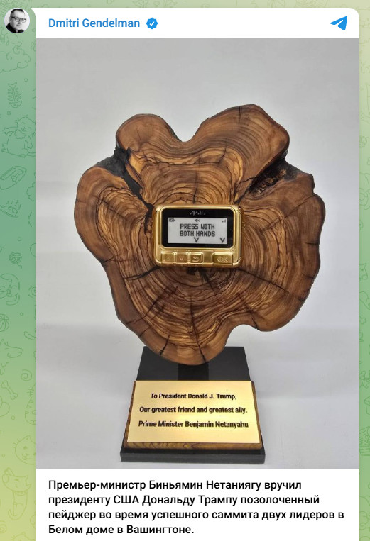 Порой Трампу преподносят такое, что вообще ни в какие ворота. Взять хотя бы позолоченный пейджер, вручённый премьер-министром Израиля Биньямином Нетаньяху во время посещения Белого дома.