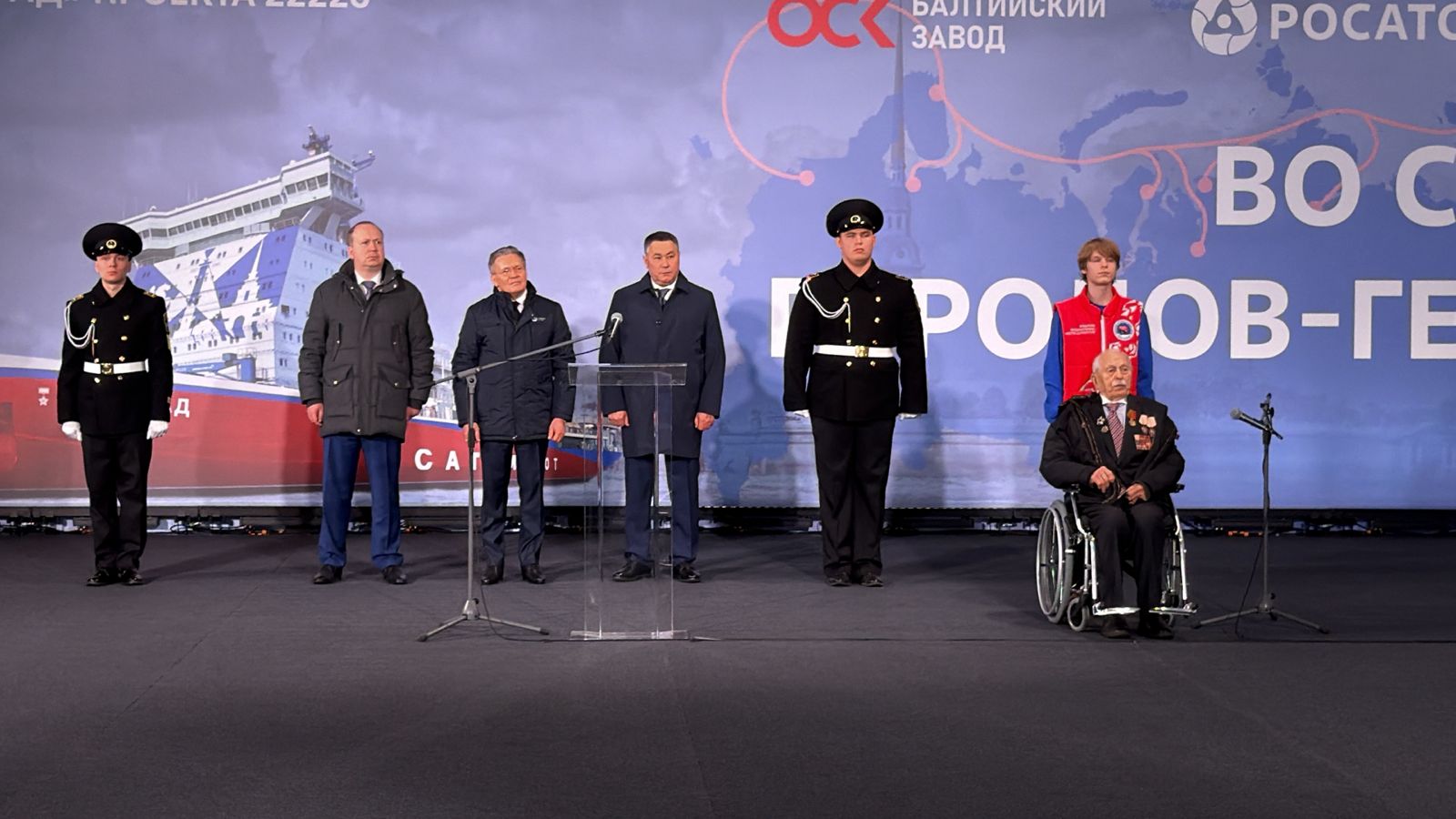 На Балтийском заводе ОСК состоялась церемония закладки седьмого универсального атомного ледокола проекта 22220 «Сталинград», названного в честь героической обороны Сталинграда в годы Великой Отечественной войны. В торжественной церемонии принял участие президент РФ Владимир Путин. Об этом сообщает корреспондент ИАА «ПортНьюс». Одним из почетных гостей торжественной церемонии закладки судна стал участник боев под Сталинградом, 103-летний ветеран Великой Отечественной войны Павел Винокуров.