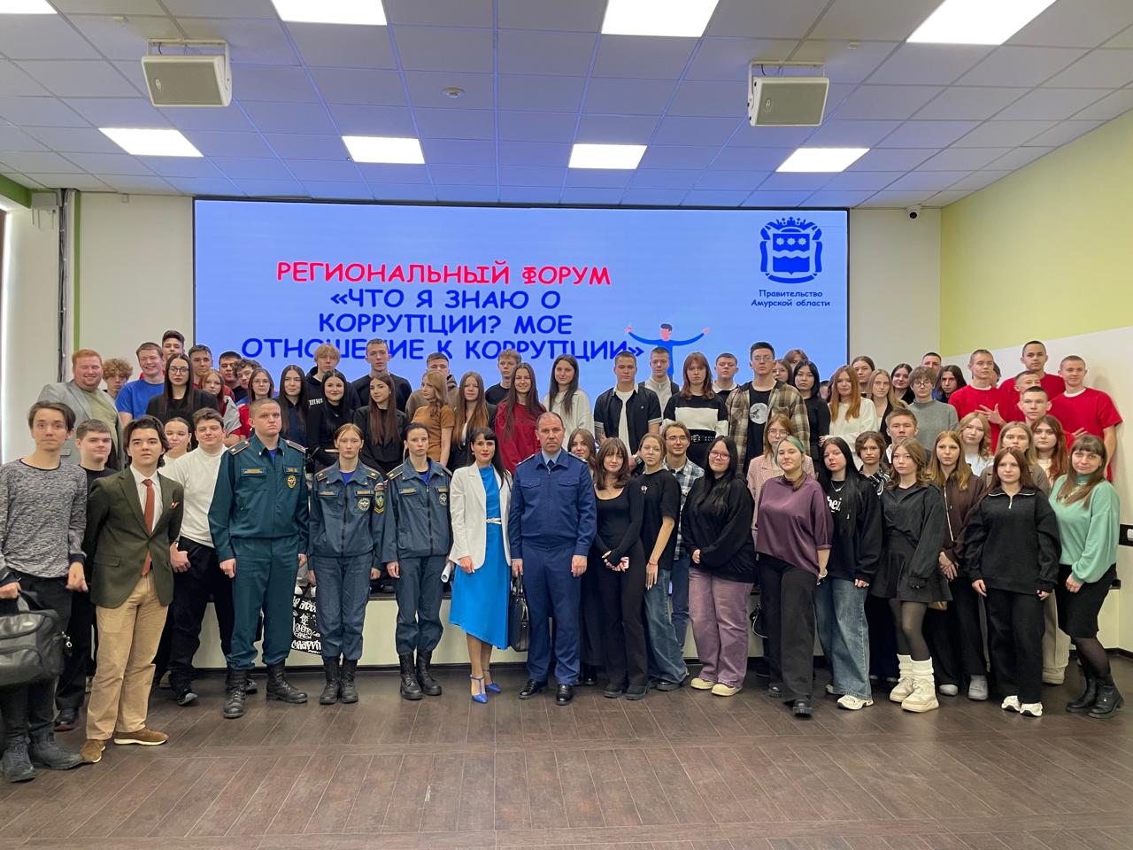 На форуме представители прокуратуры Амурской области, следственного управления СК России по Амурской области, ФГБОУ ВО «Амурский государственный университет» рассказали учащимся профессиональных образовательных учреждений Амурской области о видах коррупционных преступлений, ответственности за их совершение,  о мерах антикоррупционной профилактики в сфере образования,  о деятельности органов по профилактике коррупционных и иных правонарушений Амурской области.