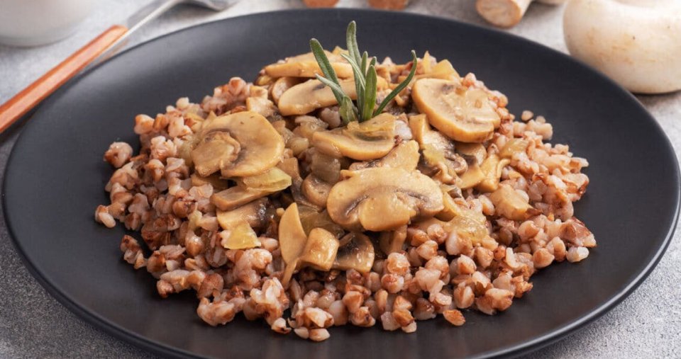 Более изысканный вариант — гречка с грибами в сливочном соусе. Такой подойдёт и для праздничного стола. Обжарьте грибы с луком, потушите в сметане и сливках, а затем смешивайте с отварной крупой. Украсить можно свежей зеленью.