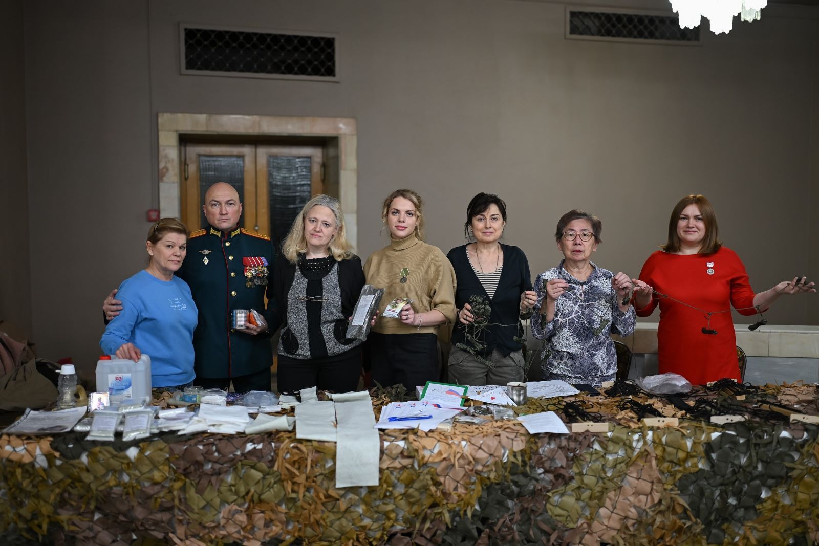 В течение вечера в фойе Центрального Дома актера работала выставка о москвичах, поддерживающих участников СВО. В их числе коллектив ГБУ «Мой особый семейный центр имени Г.И. Россолимо», сотрудники и воспитанники которого пишут письма бойцам СВО, изготавливают обереги, навещают бойцов в госпиталях; семья Алексанян, в которой родители и дети в своей квартире плетут нашлемники, заливают окопные свечи, готовят продуктовые наборы и вместе с письмами отправляют бойцам; волонтерская группа «Поддержим наших. Зеленоград», объединяющая более 700 человек, которые собирают гуманитарную помощь и лично отвозят в 26 боевых подразделений; личный состав Центра кинологической службы УВД по СВАО, который собирает гуманитарную помощь для бойцов СВО и их четвероногих напарников – служебных собак; глава муниципального округа Восточный Наталья Лебедева, которая регулярно посещает раненых бойцов в военном госпитале имени Мандрыка; старший тренер спортивного клуба «Самбо Чертаново» Олег Васильев, который с начала СВО лично ездит к бойцам на передовую, отвозит продукты, гуманитарную помощь; команда школьников, студентов и взрослых артистов-волонтеров «Возрождение Света», которые выступают в военном госпитале, где проходят лечение раненые бойцы; учитель физкультуры школы № 709, руководитель волонтерской группы «Когда мы едины, мы непобедимы» Алексей Вербкин, который вместе с сестрой занимается сбором и доставкой гуманитарной помощи в зону СВО, и другие.