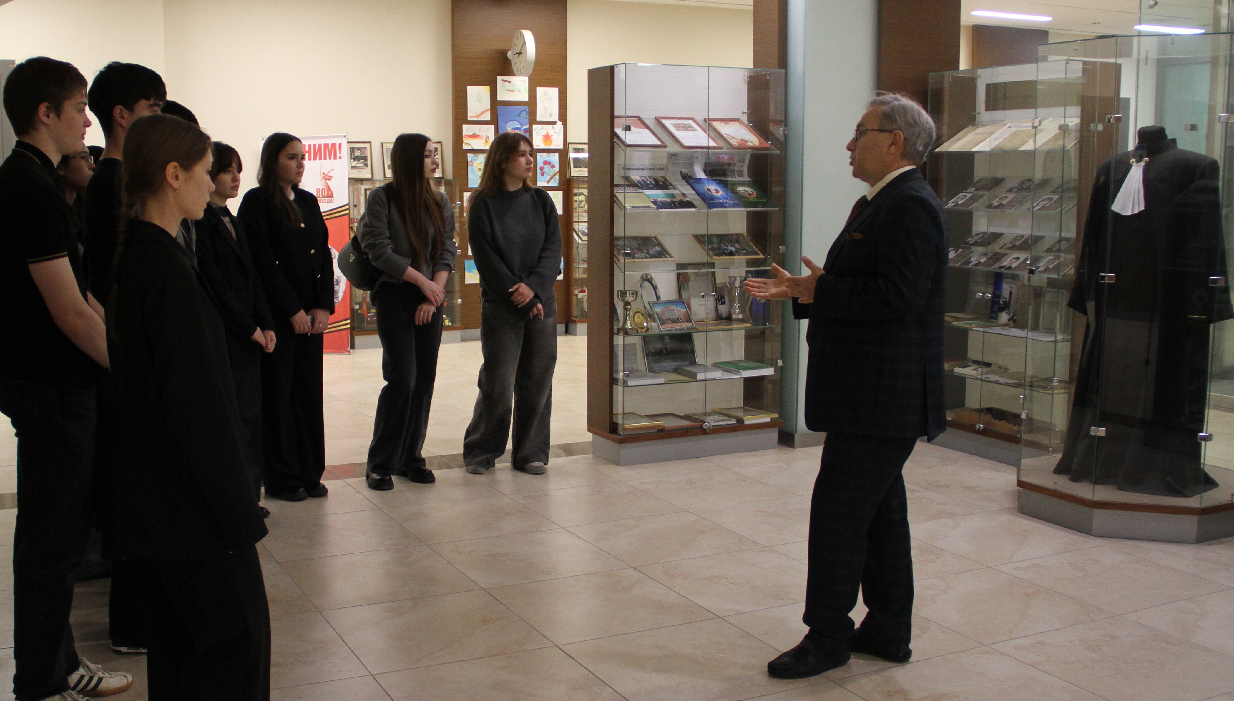 В рамках встречи судья Кириллов А.Е. рассказал студентам о формировании судебной системы и деятельности арбитражного суда республики, проинформировал о работе Госарбитража Республики Татарстан в годы Великой Отечественной войны. Также в рамках мероприятий, приуроченных к 80-летию Победы в Великой Отечественной войне, провел обзорную экскурсию, в ходе которой ознакомил с памятной экспозицией бессмерного полка и выставкой детского творчества "Победа глазами детей".