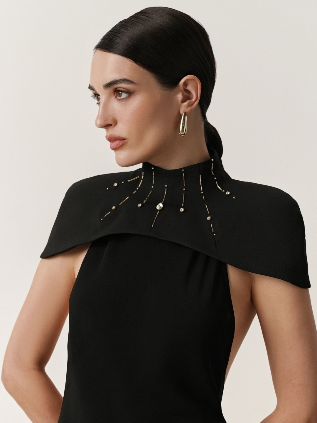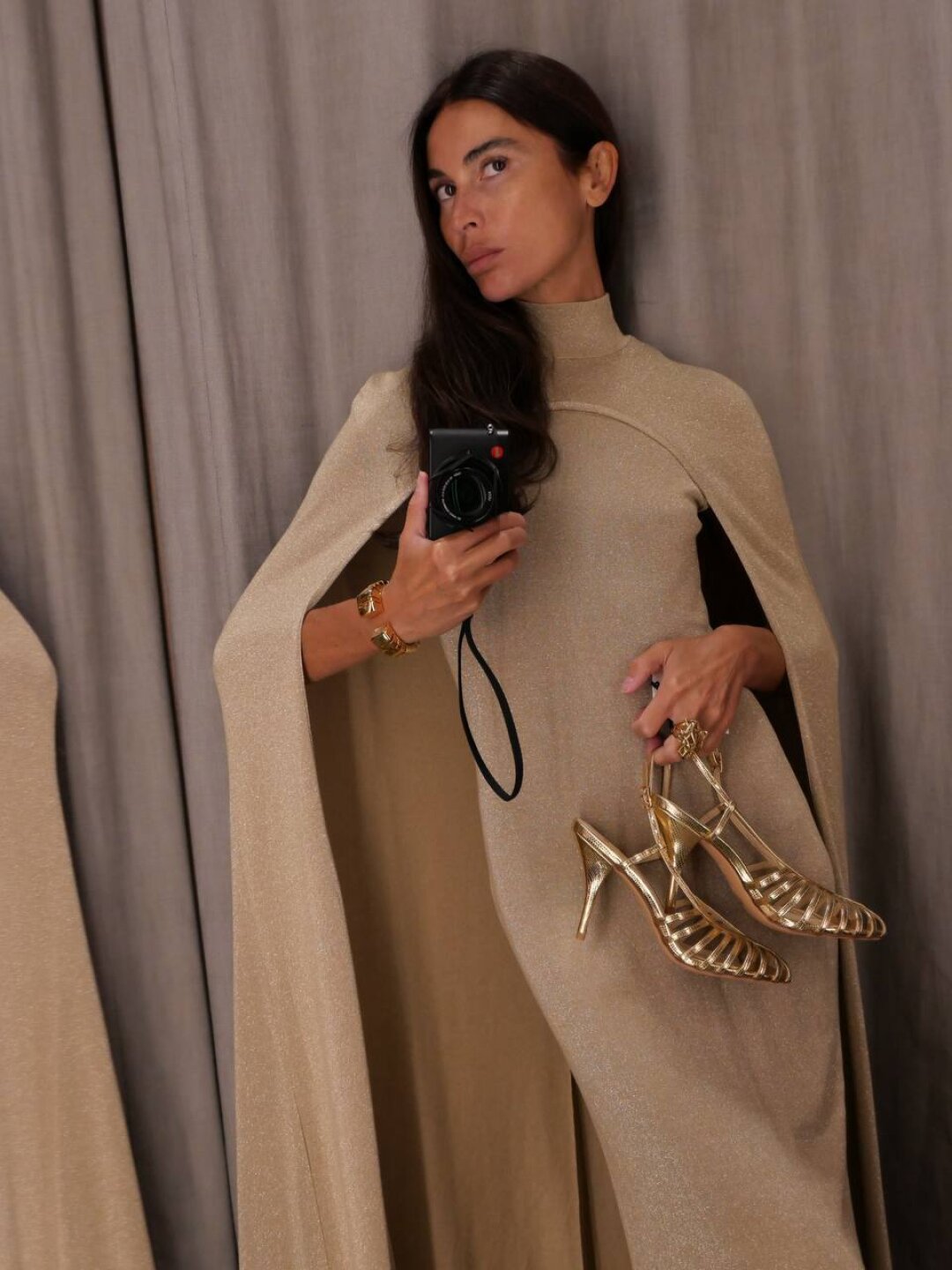 Праздничное комбо от минимал-дивы Оксаны Рим: сверкающее платье-кейп + золотистые слингбэки Lime
