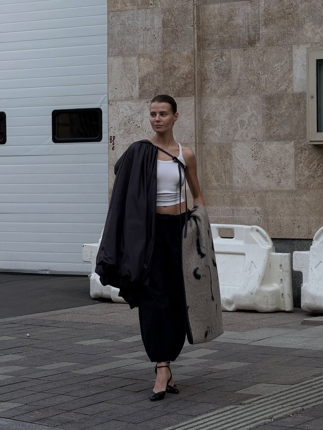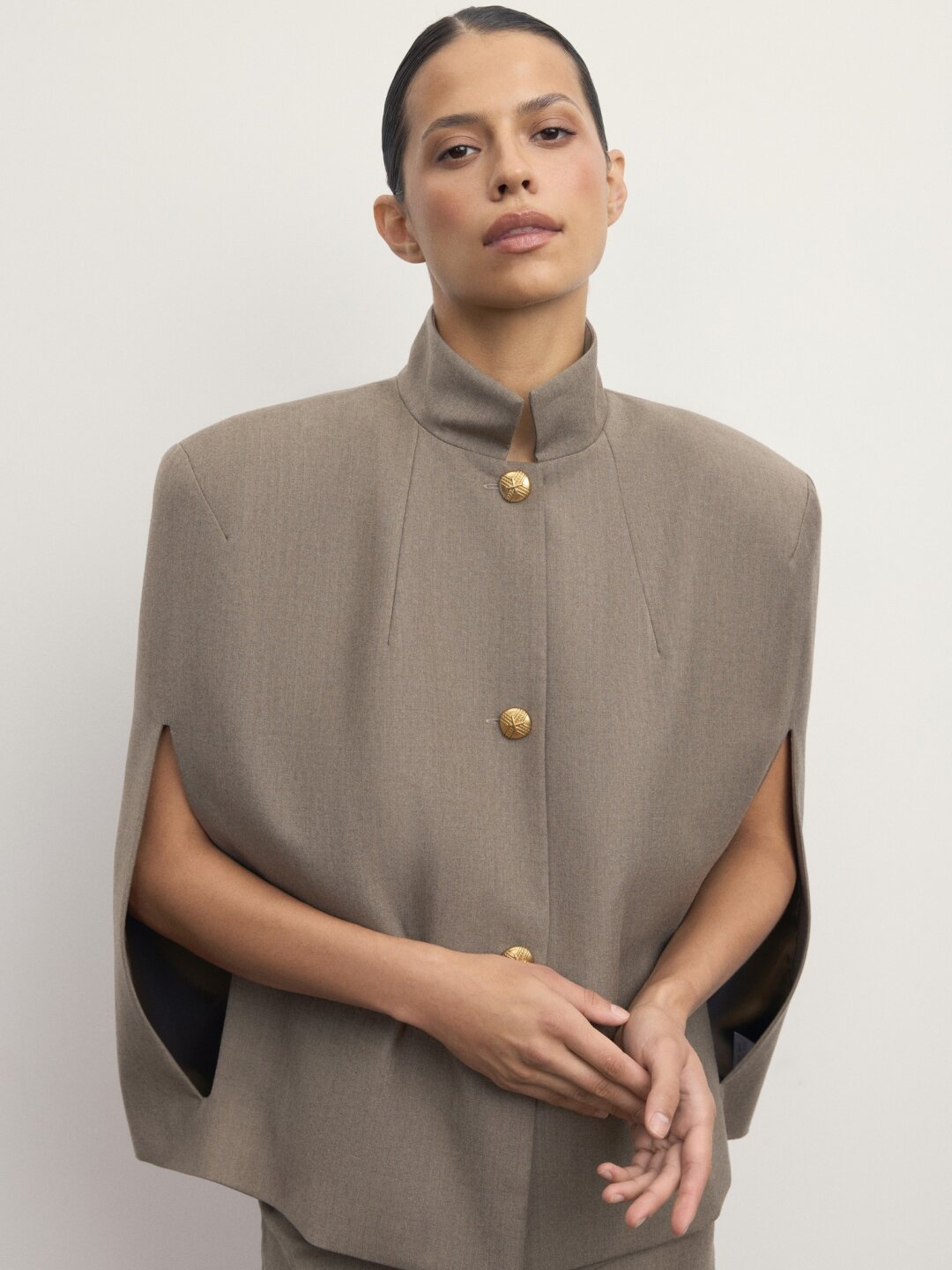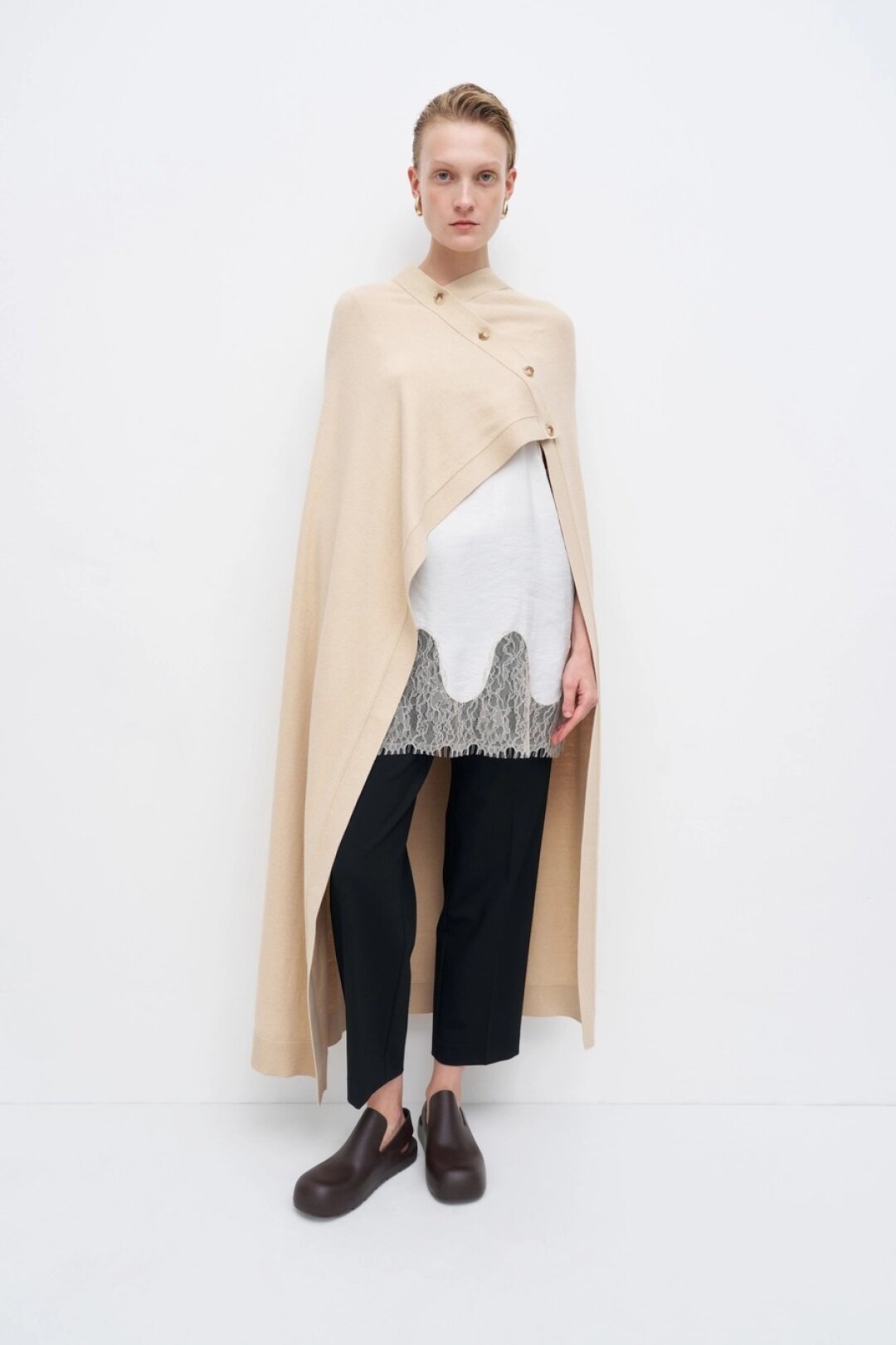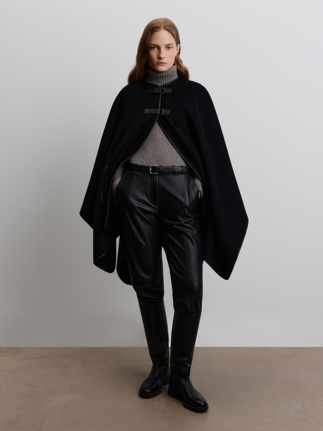 Фотограф Анастасия Рябцова дополняет кейпом Agreeg (из собственной коллаборации с брендом!) нормисный офискорный лук